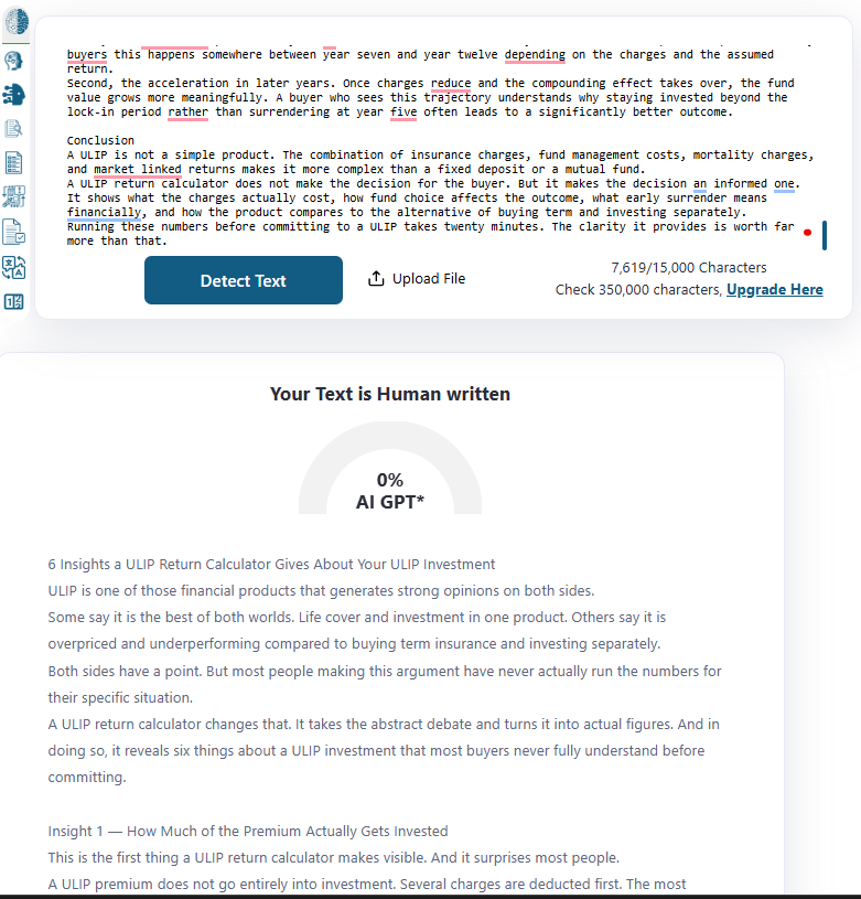 A ULIP return calculator compounds these charges across the full tenure and shows what the fund value would have been without them versus what it actually becomes with them. The difference over fifteen to twenty years is significant. Seeing this gap in actual numbers rather than percentage points helps the buyer understand the real cost of the product.